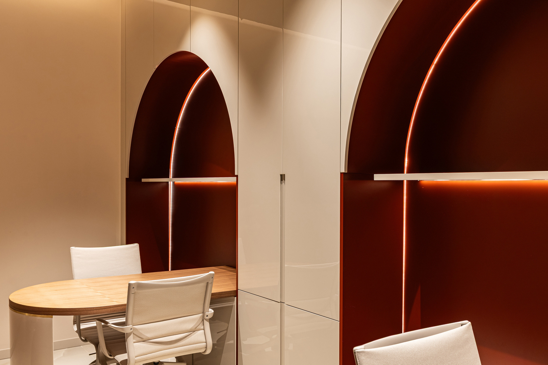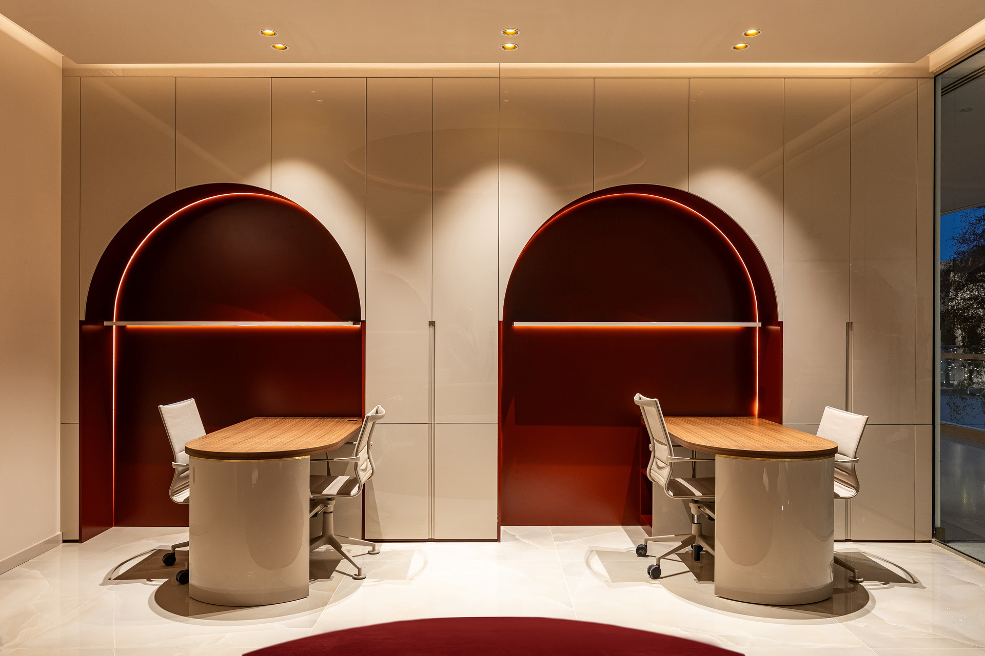 Projektom unutarnjeg uređenja predviđena je uspostava središnjeg dnevnog boravka, moderne interpretacije saloče. Unutar dnevnog boravka smješten je radni prostor, ali i pripadajući prostor za primanje klijenata. Bočni zidovi namijenjeni su smještaju radnog materijala, garderobe i ostale opreme, a u naravi su interpretacija bočnih prostora saloče.